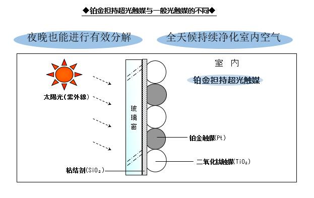 涂上空氣戰(zhàn)略鉑金擔持超光觸媒后、玻璃表面上附著著由二氧化鈦觸媒和鉑金觸媒組成的[鉑金二氧化鈦超光觸媒]以及使其固定在玻璃上的粘結劑。鉑金擔持超光觸媒通過太陽光中紫外線的照射,充分達到分解效果。所以將其涂抹于太陽光照射量最多的玻璃上時,能使其達到最大的分解效果。鉑金擔持超光