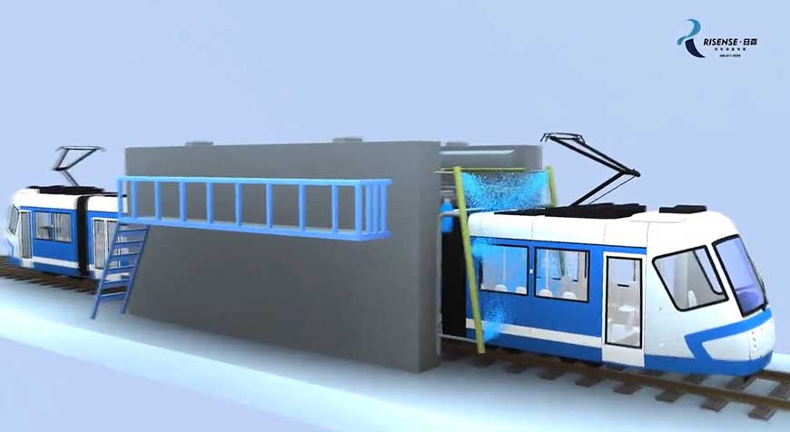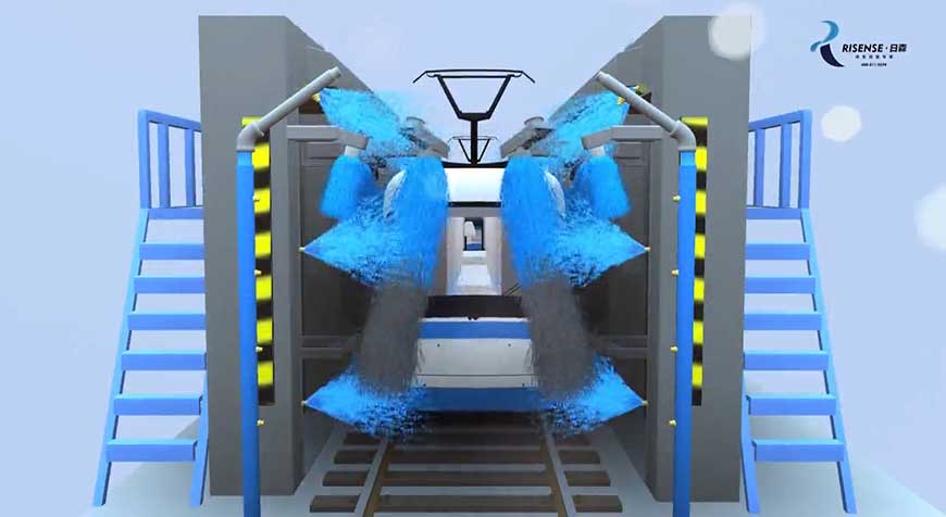 3、增加了清洗車頭和車尾的功能。我公司針對城軌電車的頭-尾的流線外形,設(shè)計了仿形清洗技術(shù)。